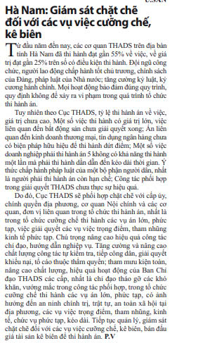 Từ đầu năm đến nay, các cơ quan THADS trên địa bàn tỉnh Hà Nam đã thì hành đạt gần 55% về việc, về giá trị đạt gần 25% trên số có điều kiện thi hành. Đội ngũ công chức, người lao động chấp hành tốt chủ trương, chính sách của Đảng, pháp luật của Nhà nước, tăng cường kỷ luật, kỷ cương hành chính. Mọi hoạt động bảo đảm đúng quy trình, quy định không để xảy ra vi phạm trong quá trình tổ chức thi hành án.